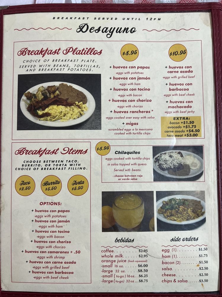 - Breakfast Platillos: Delight in flavorful breakfast dishes like Huevos Con Papas and Chilaquiles, ranging from $5.95 to $6.95.
